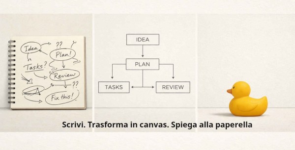Scrivere serve a far emergere ciรฒ che รจ confuso. Il canvas serve a scegliere ciรฒ che conta. Spiegare serve a verificare se quello che hai fattoโฆ sta in piedi. Se salti la scrittura, il canvas รจ vuoto. Se salti il canvas, la scrittura resta intuizione. Se salti la spiegazione, non sai se hai davvero capito. In una riga: scrivi per capire, mappa per decidere, spiega per verificare.