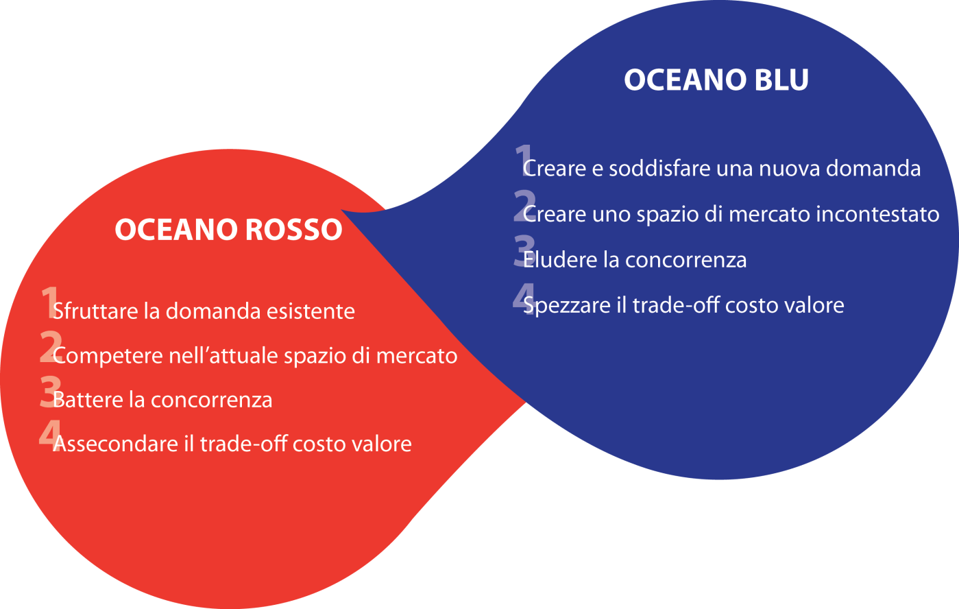 Nei mercati sovraffollati di oggi, intraprendere una lotta frontale con la concorrenza ha come conseguenza il dover competere in un sanguinante “oceano rosso” colmo di rivali che combattono sul piano concettuale di teorie basate su “visioni strutturaliste” (dette anche: ‘determinismo ambientale’) che conducono spesso ad un pensiero strategico ‘competition-based‘, ovvero basato sulla concorrenza.
