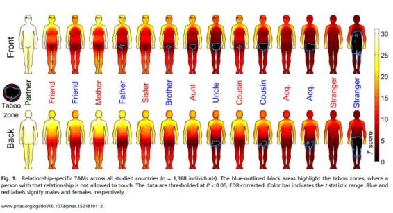 L'etologia ci spiega che i primati non umani usano il ‘contatto sociale’ per il mantenimento e il rafforzamento delle strutture sociali, tuttavia il ruolo del ‘contatto sociale’ nella costruzione dei legami umani nelle diverse relazioni dell'Uomo sociale rimane ancora irrisolto.Il Tatto è un potente strumento per comunicare emozioni positive. Tuttavia, sono state molto poche fino ad ora le ricerche per capire fino a che punto il Tocco Sociale (Social touching) mantiene e stabilisce i legami sociali. Abbiamo chiesto ad un totale di 1.368 persone di cinque paesi (Finlandia, Francia, Italia, Russia e Regno Unito) di rivelare, utilizzando uno strumento topografico per il self-reporting basato su Internet, quali sarebbero le parti del loro corpo che avrebbero permesso a parenti, amici ed estranei di toccare. Queste regioni corporee sono andate a formare delle specifiche mappe di relazione tra la forza del legame emotivo del partecipante e la persona che avrebbe toccato una particolare area descritta. Nell’analisi del risultato le influenze culturali non sono state rilevanti. La ricerca ci spinge a teorizzare che alcuni modelli corporali di contatto sociale sono specifici a rafforzare i legami emotivi relazionali nella costruzione delle relazioni e costituiscano un meccanismo importante a supporto del mantenimento dei legami sociali umani. (…) gli schemi spaziali del tocco sociale umano riflettono un meccanismo importante a sostegno del mantenimento dei legami sociali. (J. Suvilehtoa, Department of Neuroscience and Biomedical Engineering, School of Science, Aalto University)