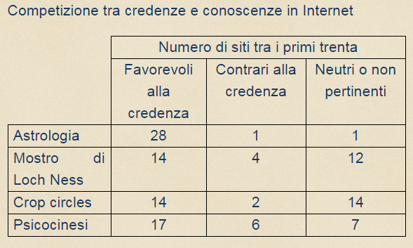 Considerando solo i siti che sostengono argomenti a favore o contro, si trova, in media, che più dell’80% dei siti, tra le prime trenta pagine proposte da Google su uno dei soggetti, sono credenti.