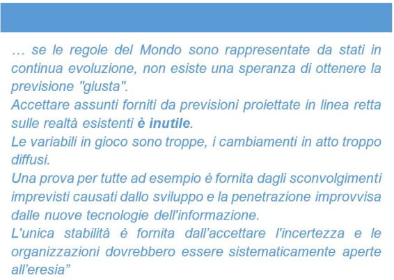Pierre Wack [*] riflette: “La pianificazione tradizionale si basava su previsioni, che funzionarono abbastanza bene negli anni ’50 e ’60 relativamente stabili. Dall’inizio degli anni ’70, tuttavia, gli errori di previsione sono diventati più frequenti e occasionalmente di entità drammatica e senza precedenti. Le previsioni non sono sempre sbagliate; il più delle volte, possono essere ragionevolmente precisi. E questo è ciò che li rende così pericolosi. Di solito sono costruiti sul presupposto che il mondo di domani sarà molto simile a quello di oggi. Spesso funzionano perché il mondo non cambia sempre. Ma le previsioni prima o poi falliranno quando saranno più necessarie: nell’anticipare importanti cambiamenti nell’ambiente aziendale che rendono obsolete intere strategie”