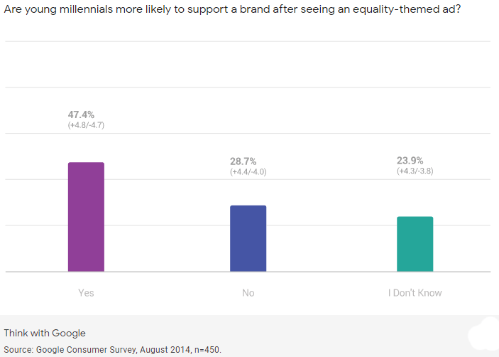 Nuovi dati da Google e YouTube mostrano che i messaggi sulla diversità e l’uguaglianza per la comunità LGBT hanno un impatto diffuso sui marchi. I marchi sono ritenuti responsabili non solo della qualità dei loro prodotti e servizi ma, sempre più, della loro posizione sui problemi politici e sociali che i consumatori di oggi devono affrontare. Ciò è particolarmente vero quando si tratta di pubblicità LGBT (lesbiche, gay, bisessuali e transgender). Secondo un sondaggio sui consumatori di Google dell’agosto 2014, sempre più attenzione è focalizzata sulla parità di diritti per la comunità LGBT, in particolare, l’uguaglianza del matrimonio e la diversità sul posto di lavoro, sta influenzando il modo in cui i consumatori prendono le decisioni. Ciò è particolarmente vero tra i giovani; oltre il 45% dei consumatori di età inferiore ai 34 anni afferma di avere maggiori probabilità di fare affari ripetuti con un’azienda LGBT-friendly, dopo 7 anni questa percentuale si conferma e in alcuni casi si incrementa. Di questi, oltre il 54% afferma anche che sceglierebbe un marchio incentrato sull’uguaglianza rispetto a un concorrente.