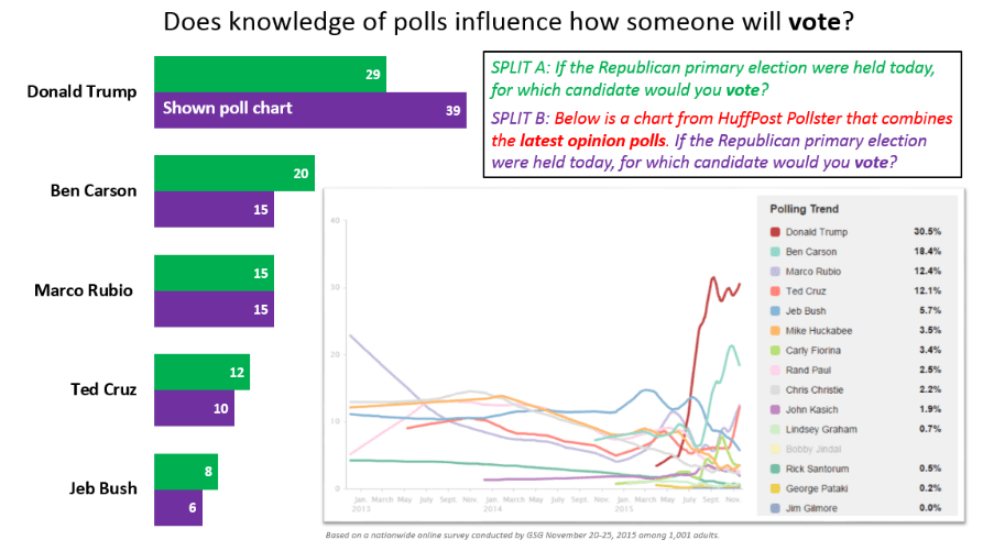 Tra gli intervistati che hanno visto i risultati del sondaggio, Trump ha ottenuto 10 punti in più, con il supporto della grafica che mostrava Trump come il vincitore previsto rispetto agli altri candidati, rispetto agli intervistati ai quali non era stato mostrato il grafico.