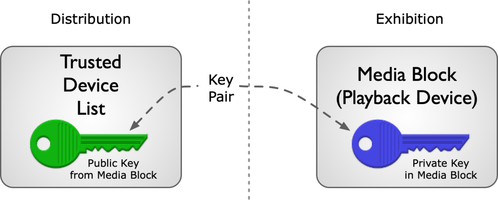 In pratica, i distributori creano e mantengono una Trusted Device List (TDL), abbinando i certificati dei dispositivi contenenti chiavi pubbliche alla posizione dei dispositivi attendibili.