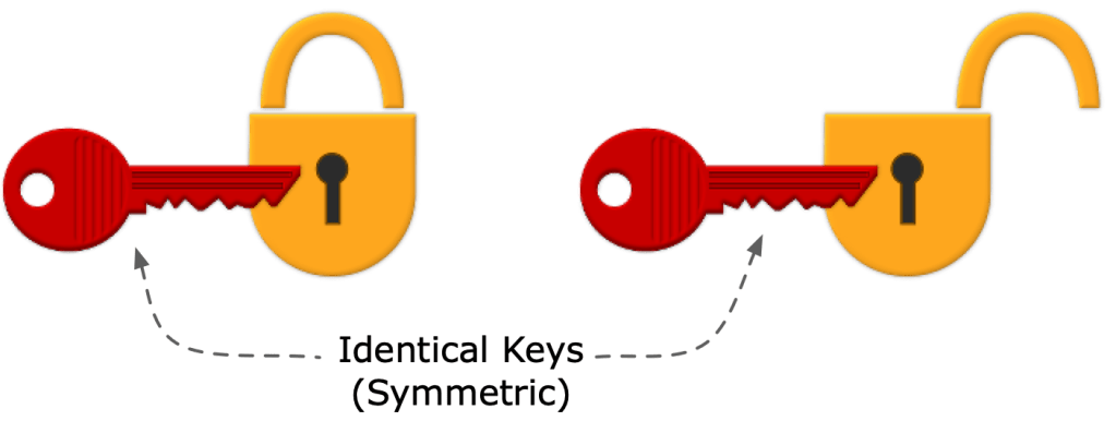 Esistono due classificazioni degli algoritmi crittografici: simmetrico e asimmetrico. La crittografia a chiave simmetrica utilizza la stessa chiave per bloccare e sbloccare i dati. Questo concetto è illustrato nella figura qui di seguito, dove la chiave rossa rappresenta una chiave simmetrica.