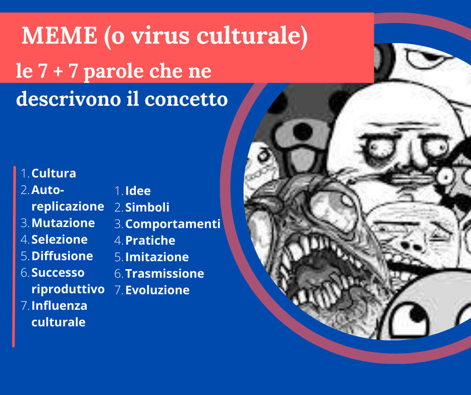 Secondo gli sostenitori del concetto di Meme, questi elementi culturali agiscono come unità per il trasporto di idee culturali, di simboli, o di pratiche che possono essere trasmesse da una mente all’altra. Proprio come i geni biologici, i Memi hanno la capacità di auto-replicarsi, di mutare e di rispondere alle pressioni selettive. Ciò significa che i Memi sono un fenomeno virale che può evolvere per selezione naturale in modo analogo a quello dell’evoluzione biologica.