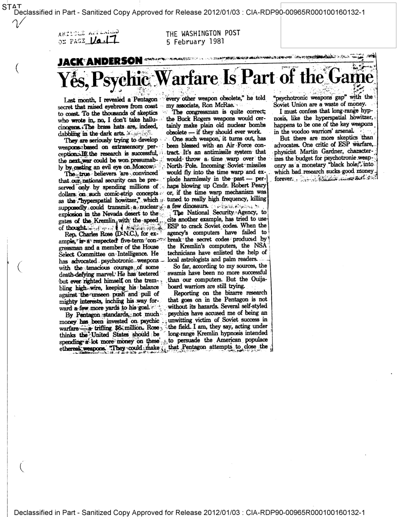 Tra queste, viene citato nei rapporti dei servizi l’ipotetico generatore psicotronico (tecnologia di controllo mentale o psico-correzione acustica sviluppato già a partire dagli anni ’70) che viene descritto in un documento ( U.S. explores russian mind-control technology) come un dispositivo in grado di produrre potenti emanazioni elettromagnetiche (onde sonore) , con lo scopo di alterare o influenzare il comportamento umano sia su soggetti consenzienti che non consenzienti che potrebbe essere usata per sopprimere rivolte, controllare dissidenti, demoralizzare forze nemiche e migliorare le performance delle forze alleate.