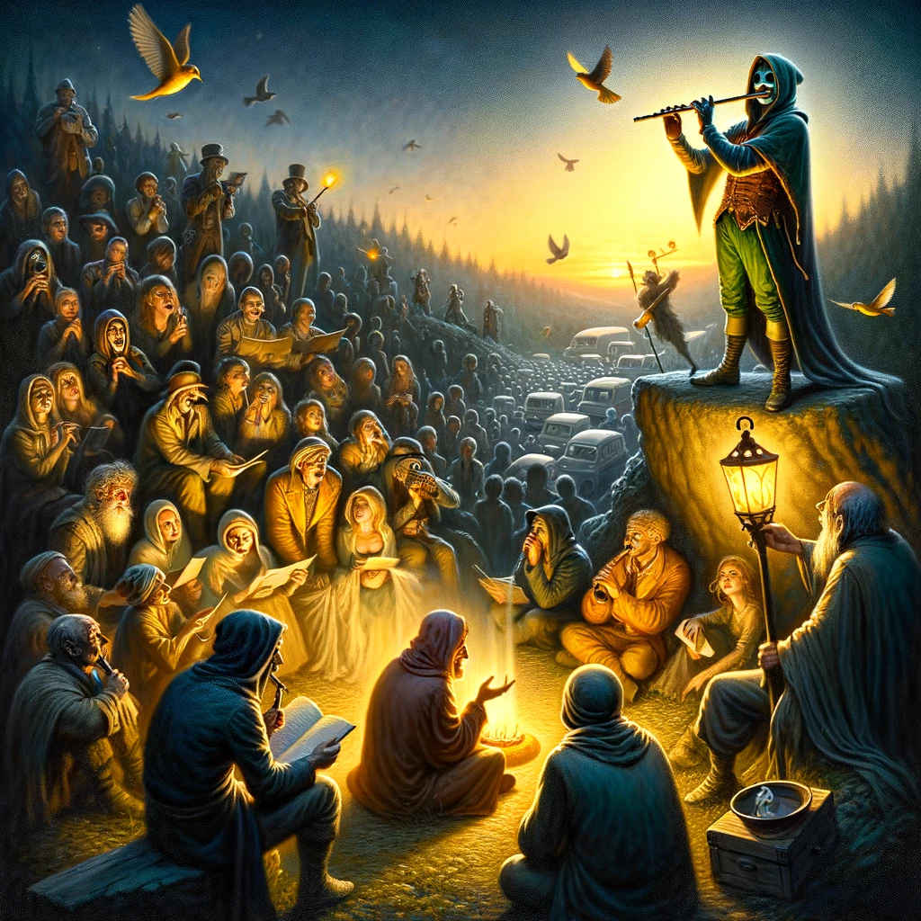 La sinergia tra l’Artista, il Saggio e il Giullare creò un’armonia perfetta che disperse la nebbia di smarrimento. Innovia fu nuovamente bagnata dalla luce dell’autenticità e dell’ispirazione. Il Giullare, con il suo flauto d’argento, non era più un pifferaio che conduceva gli abitanti verso l’illusione, ma un maestro di cerimonie che celebrava la rinascita della valle.
