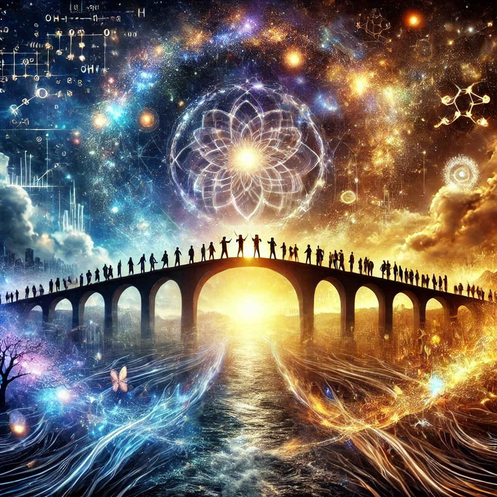 Immaginate un ponte sospeso tra due rive lontane: da un lato, il dominio della scienza, con le sue leggi matematiche e i misteri dell’universo; dall’altro, il regno della spiritualità, con la sua ricerca di senso e trascendenza. Al centro, una Umanità che avanza, sospesa tra il visibile e l’invisibile, pronta a intrecciare conoscenza e intuizione. Questa visione rappresenta l’essenza di una nuova Era Assiale: un momento in cui crisi e complessità globali spingono a ripensare il nostro posto nel Cosmo. Qui, scienza e spiritualità non sono più antagoniste, ma parti complementari di un dialogo che cerca di rispondere alle grandi domande dell’esistenza: Chi siamo? Qual è il nostro scopo? In questa trasformazione, l’Umanità non solo osserva il mondo, ma diventa co-creatrice di una realtà che integra il razionale e il trascendente, tracciando un sentiero verso un futuro dove mente, materia e cosmo si armonizzano in una nuova visione globale.