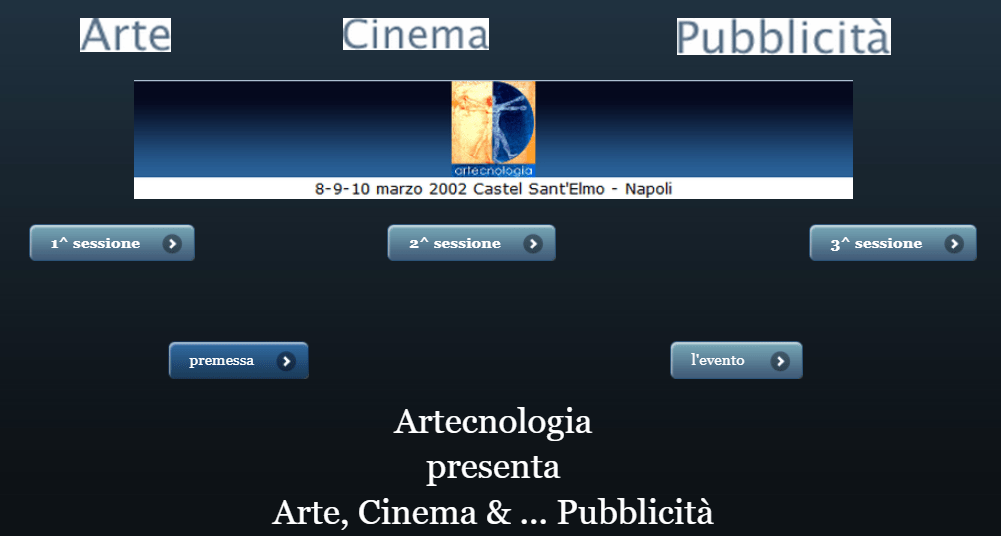 Mi piace oggi ricordare che nel marzo del 2002, in collaborazione con l’Istituto Universitario Suor Orsola Benincasa di Napoli e con il sostegno morale e il patrocinio della Provincia di Napoli, ho elaborato e promosso, attraverso l’Associazione Culturale Artecnologia, il convegno Arte, Cinema & Pubblicità.