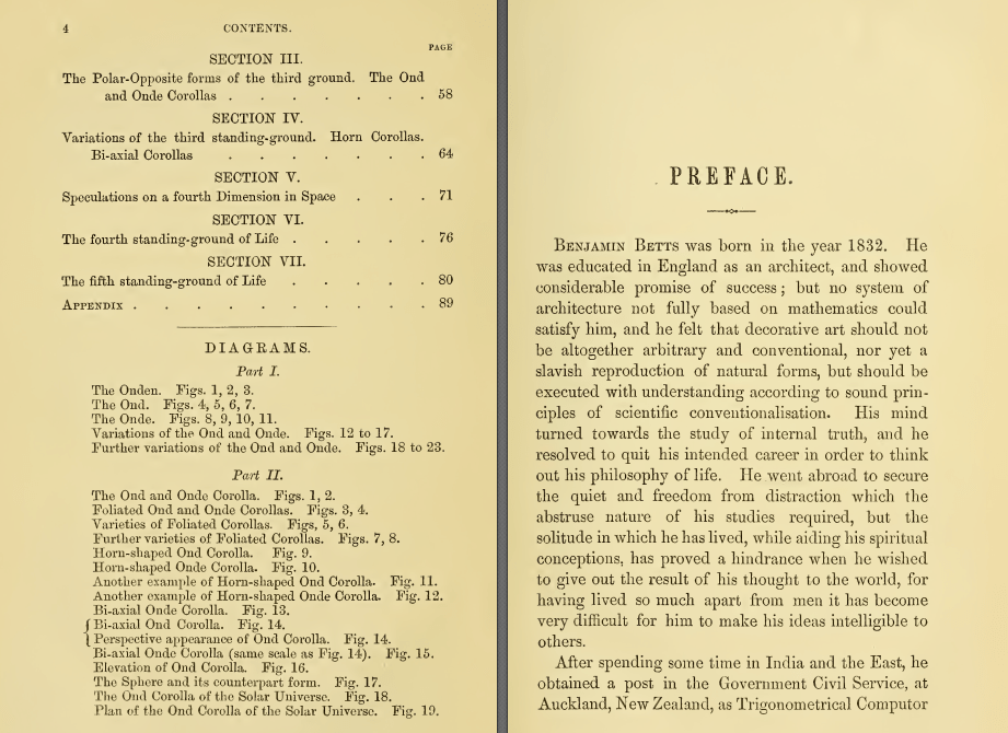 Benjamin Betts, architetto e teorico del XIX secolo, concepì un sistema di rappresentazione geometrica della coscienza umana, fondendo speculazione matematica e visione metafisica. Il suo studio, condensato nel volume Geometrical Psychology, or, The Science of Representation pubblicato nel 1887, introduce una serie di diagrammi che raffigurano la progressione della consapevolezza attraverso strutture geometriche complesse.