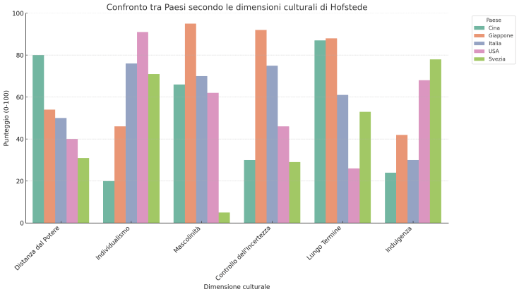 L’Italia occupa una posizione intermedia, ma con una forte tendenza alla valorizzazione dell’individuo (76), un controllo elevato sull’incertezza (75), che paradossalmente rende il Paese cauto verso l’innovazione, e un discreto orientamento al lungo termine (61). Un dinamismo contraddittorio: ricco di patrimonio, ma spesso senza un disegno coerente per trasformarlo.