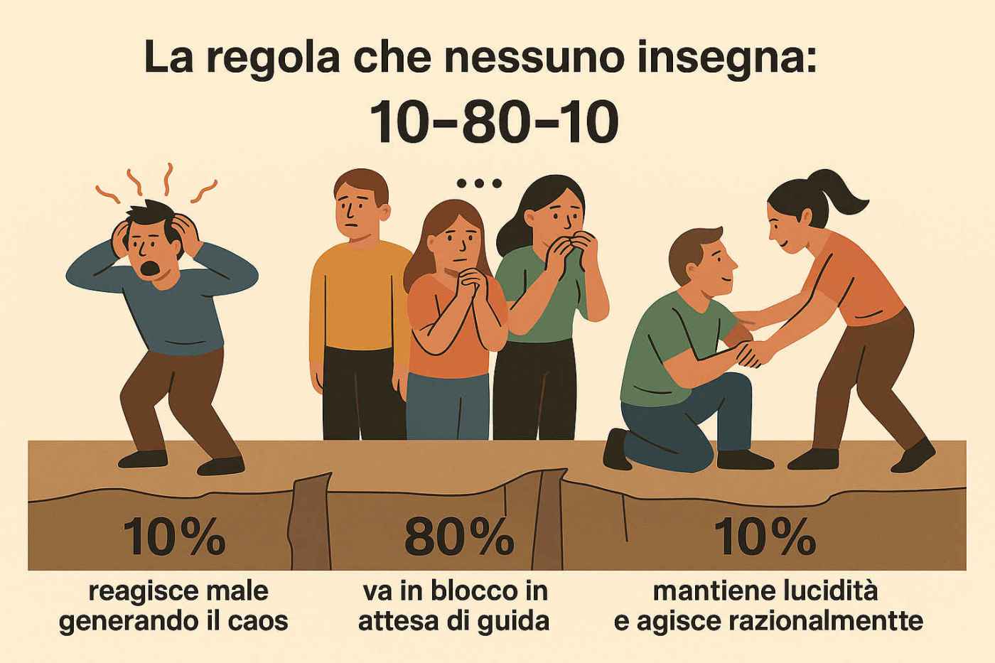 La regola che nessuno insegna: 10–80–10. Non è una legge scientifica fissa, ma una costante osservata in addestramenti militari, esercitazioni di protezione civile e incidenti reali.