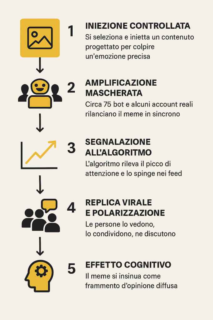 Questo contenuto viene “iniettato” nel sistema attraverso un numero selezionato di bot, ovvero account automatici coordinati per rilanciare lo stesso meme nello stesso intervallo temporale. - Amplificazione mascherata
