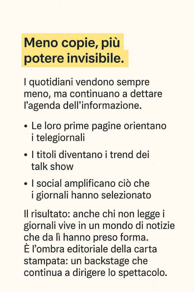 Sono loro, i giornali, a stabilire le priorità della giornata, anche per chi non li compra più.È questo il cuore del paradosso della carta: meno copie vendute, più potere invisibile.