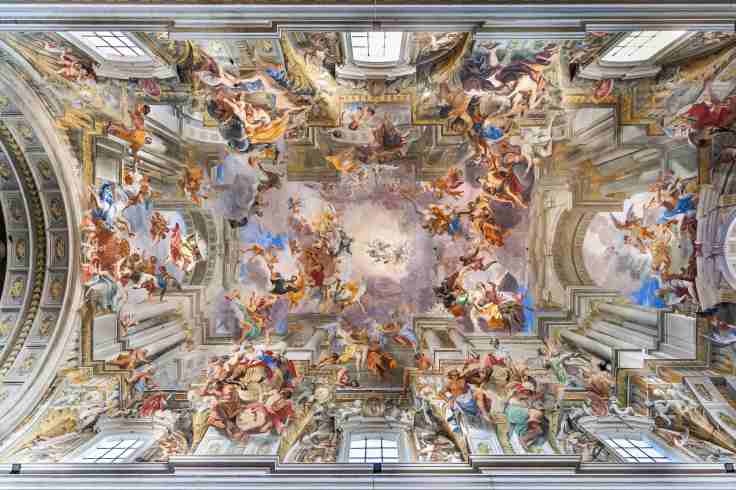 Il soffitto dipinto, da Andrea Pozzo, sembra aprirsi all’infinito, ma quell’infinito non lo vedi ovunque. Devi metterti nel punto giusto. Devi fermarti, cercare, posizionarti. Solo allora la visione si compone. Non è un dettaglio tecnico: è una lezione.