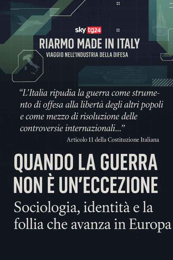 LA GUERRA E' UNA ECCEZIONE ...?? Ma cosa accade quando a pronunciare la parola riarmo non รจ un generale, ma un canale all news? Ho appena visto il servizio speciale di Sky TG24 intitolato "Riarmo made in Italy": 24 minuti di racconto patinato e orgoglioso sullโindustria bellica italiana. Nessuna domanda. Nessuna ombra. Solo entusiasmo. Cosรฌ ho scritto. Perchรฉ davanti a questa โnormalizzazione della guerraโ che si insinua nel linguaggio e nei telegiornali, ho sentito il bisogno di reagire. La guerra, ricorda la sociologia, non รจ unโeccezione. ร un fatto sociale che ci plasma, anche quando non la combattiamo. Allora vi invito a leggere questo pezzo e a chiedervi: In che tipo di societร stiamo vivendo, se la pace non si costruisce piรน, ma si sospende? #Pace #Costituzione #Riarmo #SociologiaDellaGuerra #DifesaONorma #Articolo11 #ComunicazioneDelRischio #DirittiEDovere #GuerraENarrazione #CulturaCritica #RiarmoMadeInItaly